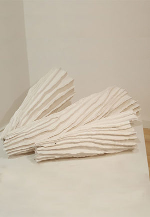 Zum anderen experimentiere ich mit dem Werkstoff Paperclay – einem Ton, der einen Anteil Papierfasern enthält – und damit eine breite Palette an künstlerischen Ausdrucksmöglichkeiten bietet. Diese z.T. „schwebenden Objekte“ aus Paperclay bekommen durch die Behandlung der Oberfläche mit Porzellanengobe Leichtigkeit und Transparenz. Die Farbe „weiß“ dominiert und verweist damit auf die „reine“ Form der Objekte, die ihre Wirkung durch Licht, Schatten und Bewegung entfalten.